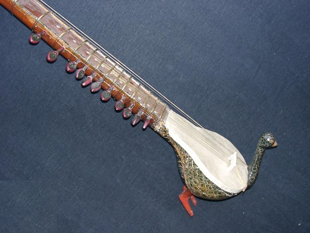 Le manche laqué rouge est muni de frettes et de onze cordes sympathiques. Il se termine par une tête de serpent polychrome.